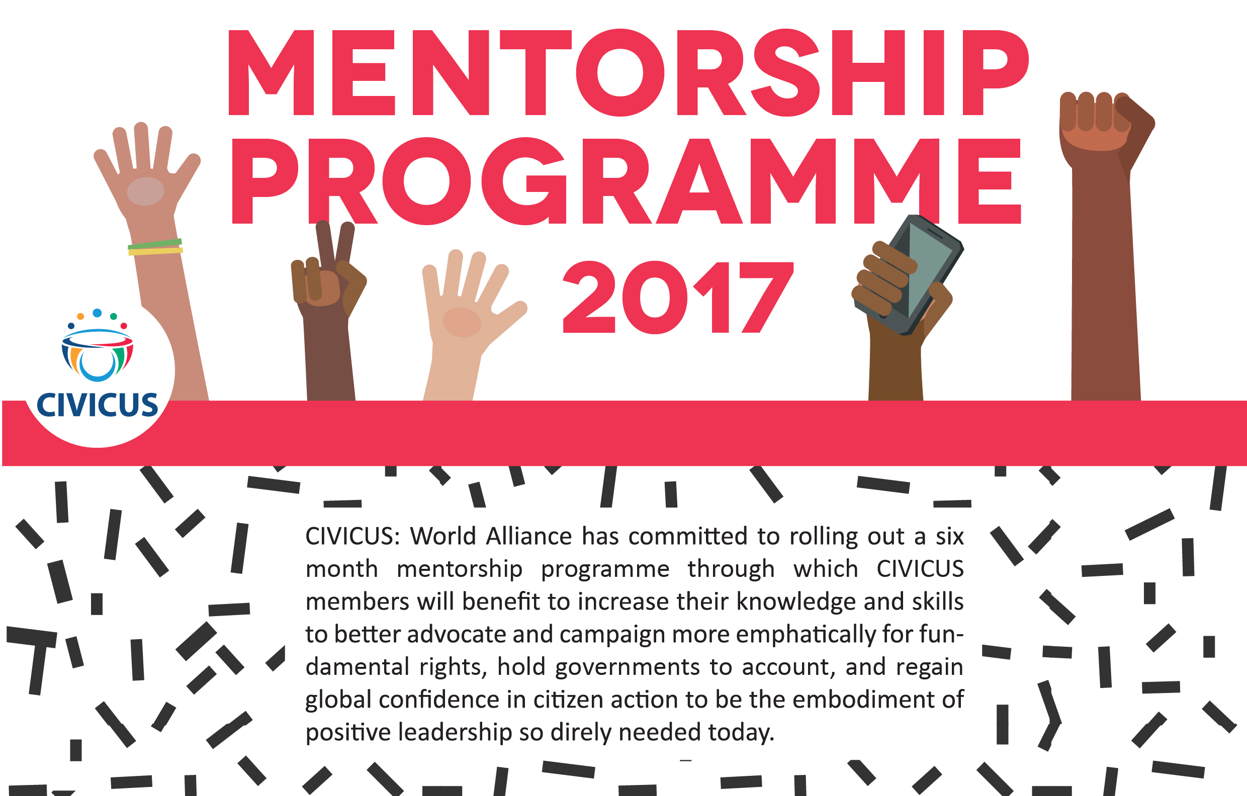CIVICUS: World Alliance for Citizen Participation is offering to all members a 6-month voluntary mentorship programme to support civil society actors to connect, share knowledge and develop skills and networks.