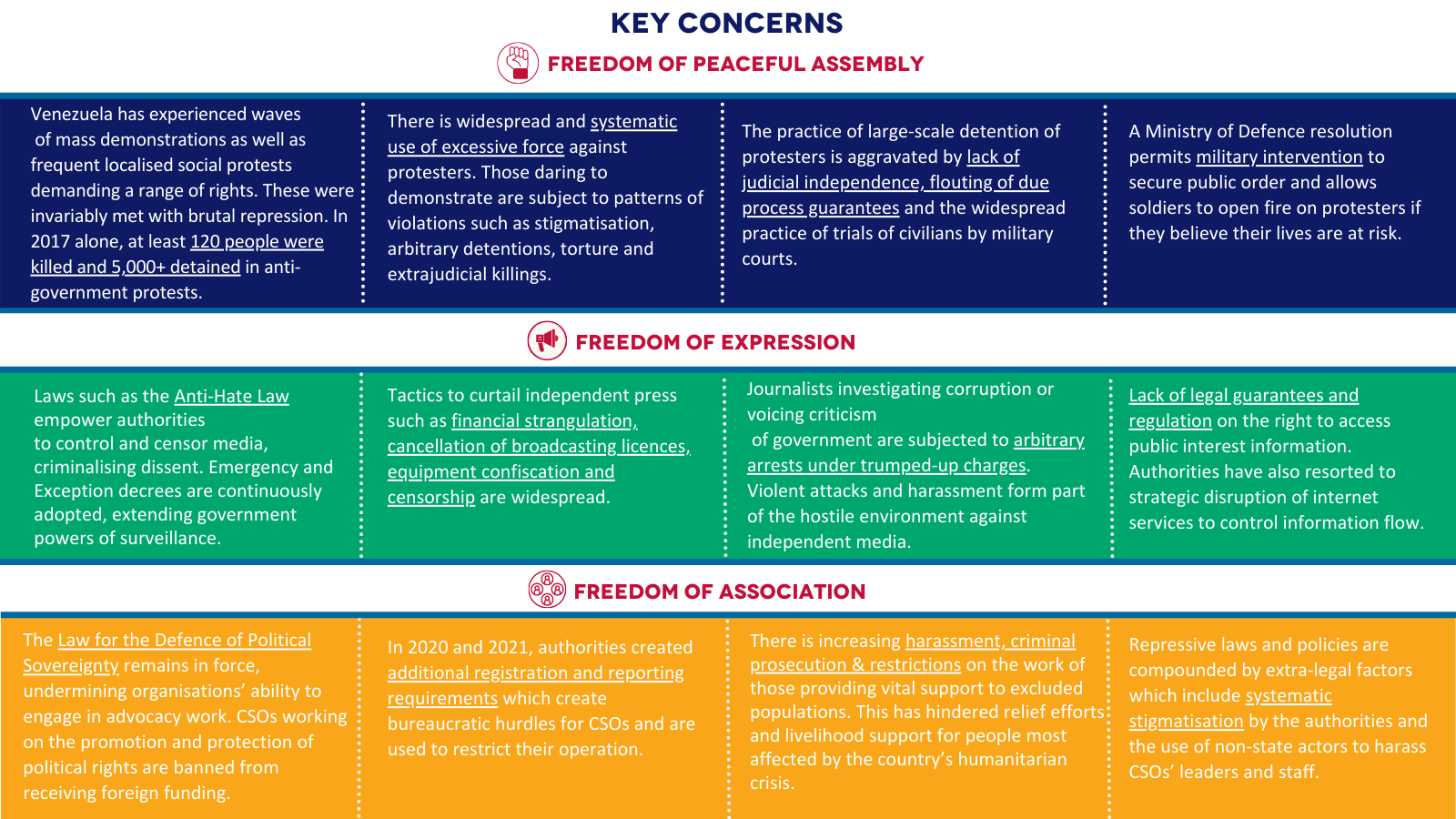 We are deeply concerned by the restrictions facing civil society organisations, particularly those working on humanitarian and human rights issues. Judicial persecution and financial restrictions against civil society, rights defenders and journalists have intensified, combined with a stigmatising discourse that seeks to justify attacks against the legitimate exercise of the freedoms of association and expression. We are also alarmed by the continuing systematic suppression of peaceful protests.