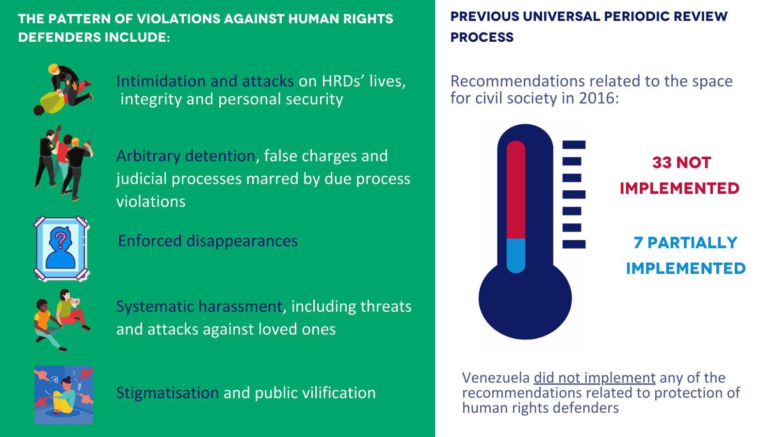 The last time the country’s rights record was reviewed was in November 2016, when UN member states made a total of 274 recommendations, 40 of which related to civic freedoms. Venezuela subsequently accepted 23 recommendations and committed to taking concrete measures. Among these measures, to “fully guarantee freedom of expression and free access to information and protect journalists against threats and attacks” and to ensure “a proportional use of force by security forces and ensure that cases of torture are investigated and that the perpetrators are brought to justice.”