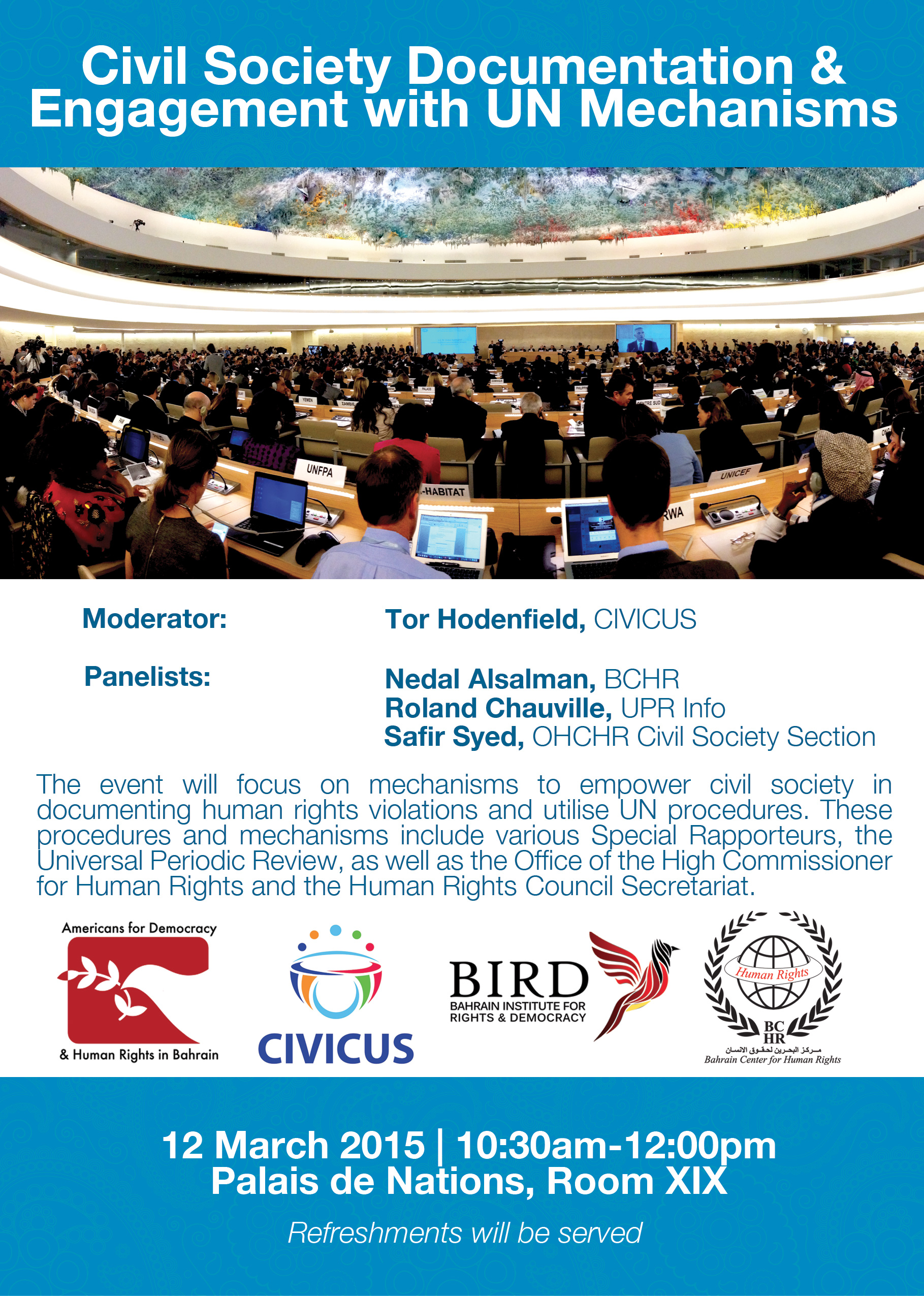 During the 28th Session of the UN Human Rights Council, 2-27 March 2015, CIVICUS and its partners made several high-level interventions to support the creation and maintenance of a safe and enabling environment for civil society across the world. CIVICUS co-organized a number of thematic and country specific side events to draw attention to acute restrictions on civil society, human rights defenders and fundamental democratic freedoms. In addition, CIVICUS issued several oral statements calling on the Council to address persistent violations of basic human rights.