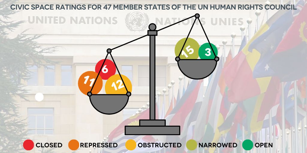 More people than ever before live in countries where state and non-state actors are routinely allowed to imprison, injure and kill people for exercising their fundamental freedoms and over 85% of the world’s population currently live in countries with serious civic space restrictions. The CIVICUS Monitor has documented that global civic space conditions which enable the participation of civil society in decision making are increasingly challenging, with only 2.1% of people living in ‘open’ countries where civic space is both free and protected, the lowest percentage and almost half the rate of six years ago when the Monitor was launched. In this context, it is vital the Human Rights Council effectively respond to regression both the regression of civic space globally and specific country situations.